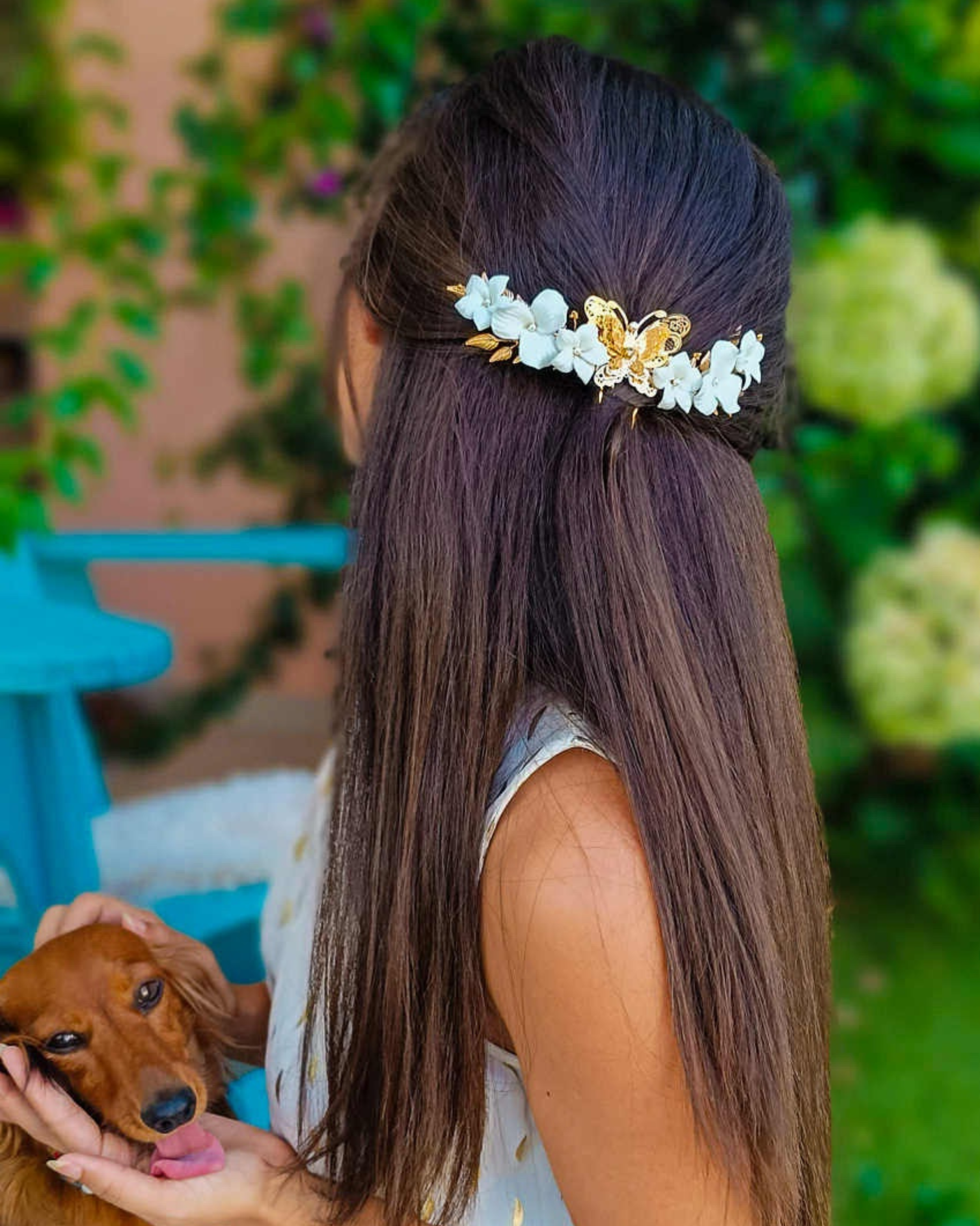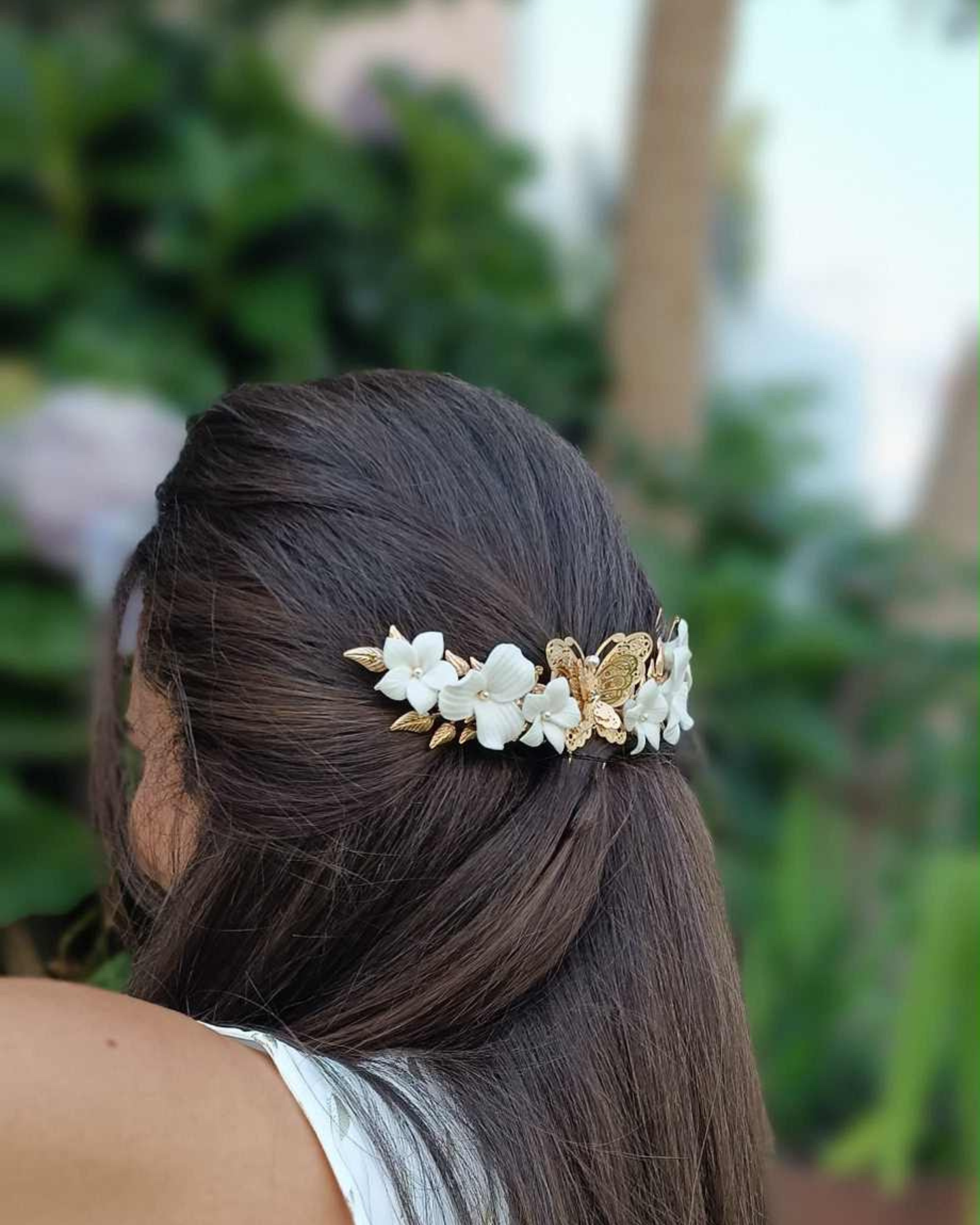 Surrounded by white flowers that evoke purity and serenity, the butterfly rests like a precious secret, bringing harmony to both hair and soul.