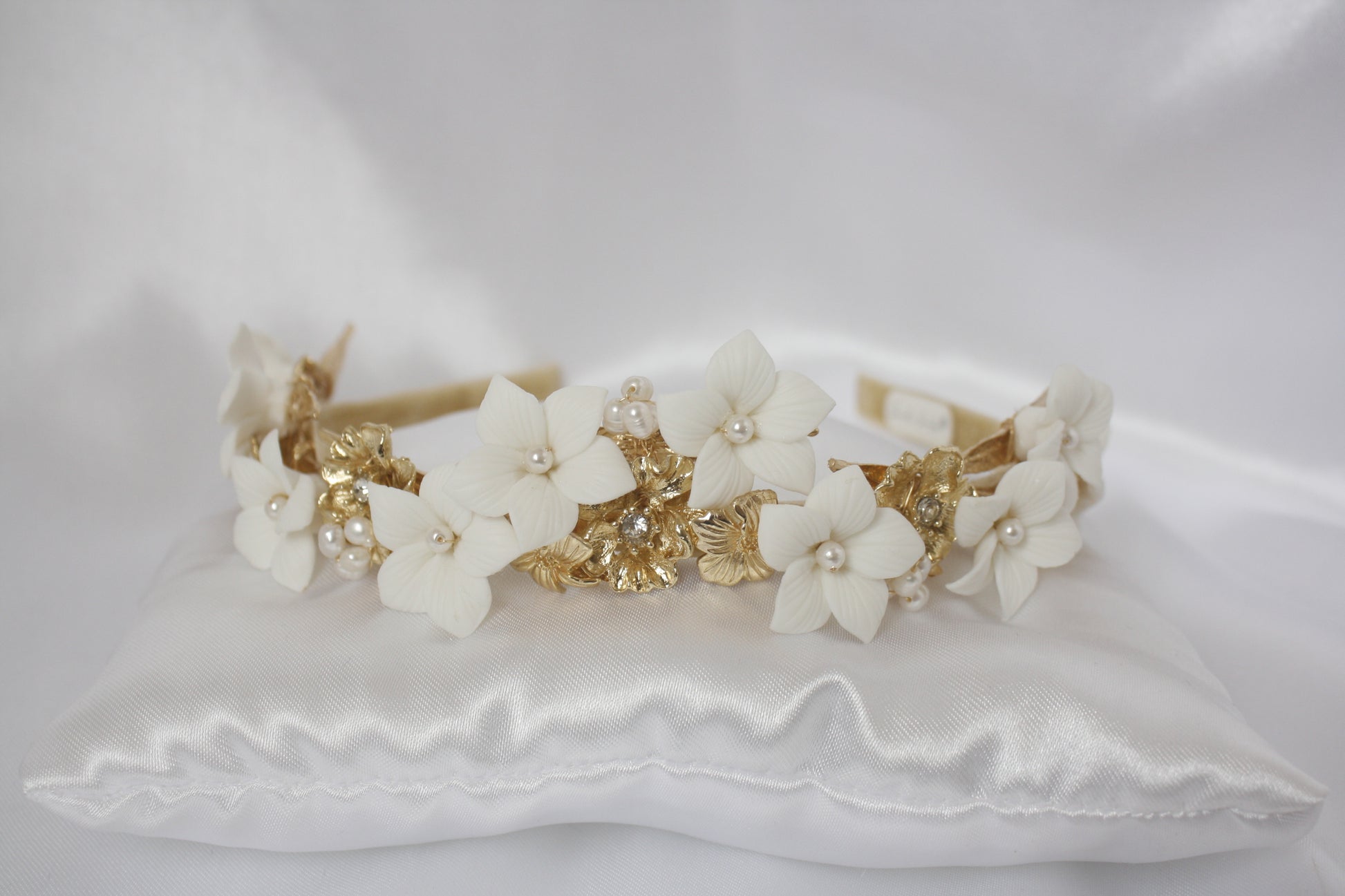 A headpiece that beautifully evokes the Bridgerton era: white flowers that speak of innocence, golden blooms that embody refinement, metallic leaves that capture every glimmer of candlelit evenings, and freshwater pearls that whisper timeless tradition.