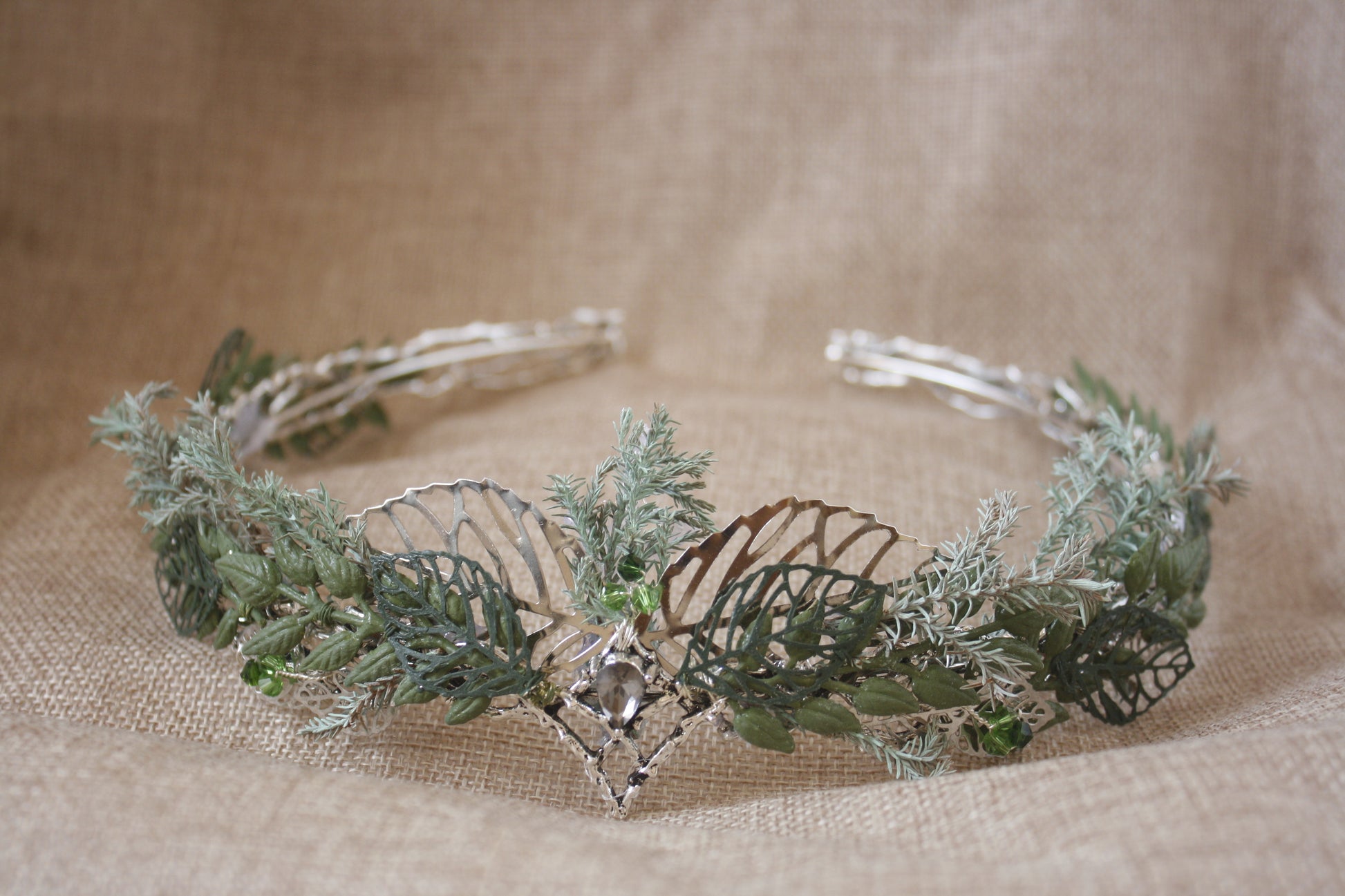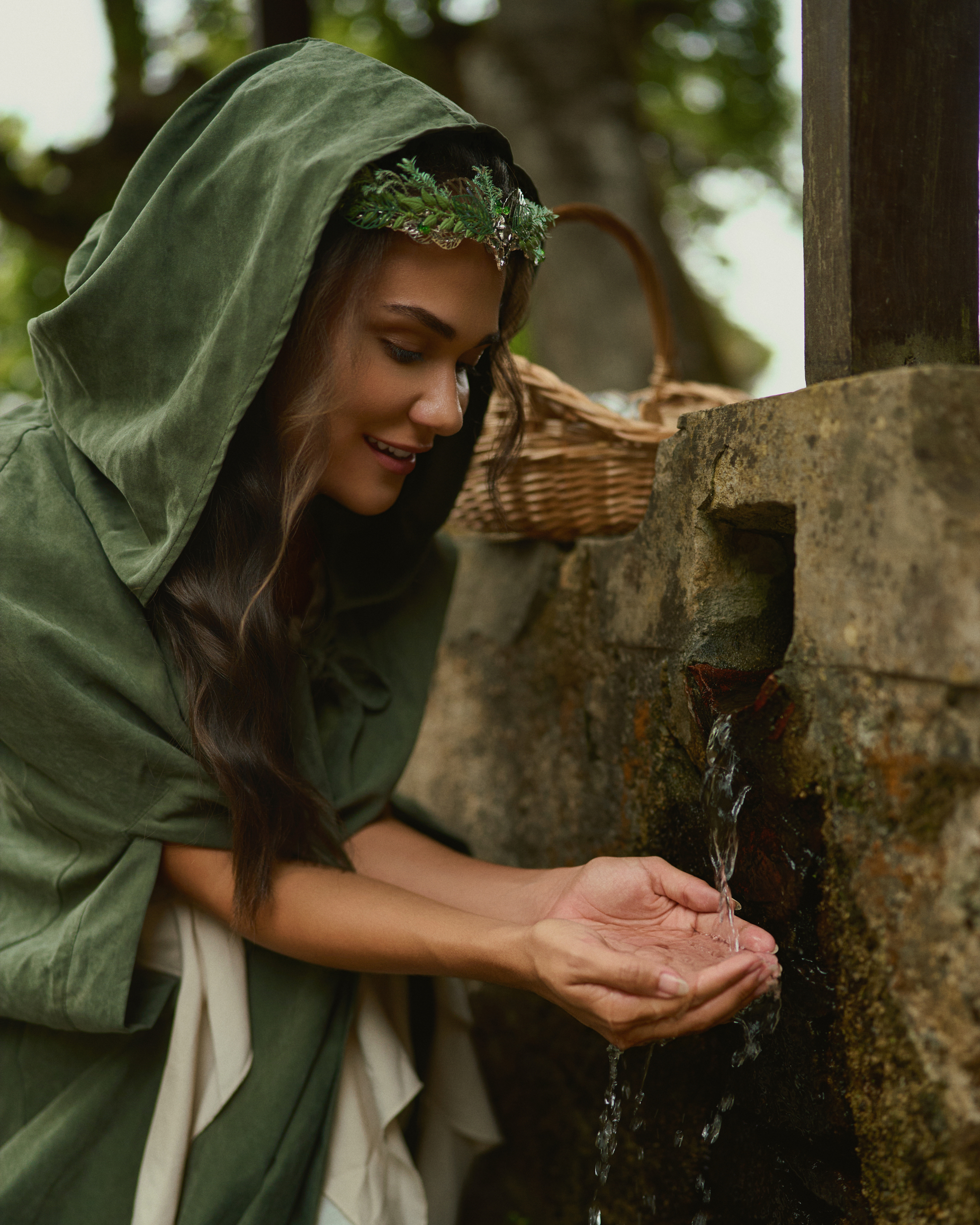 Forjado com o sopro das florestas e o brilho das ervas sagradas, este toucado é mais do que um adorno: é um símbolo de sabedoria ancestral. Cada folha entrelaçada representa um segredo guardado pelas mulheres que curavam com mãos suaves e palavras antigas. As contas verdes cintilam como gotas de orvalho, e os ramos evocam os caminhos ocultos da medicina natural. Criado especialmente para esta sessão, ele coroa a figura da curandeira medieval — mística, forte e profundamente ligada à terra.