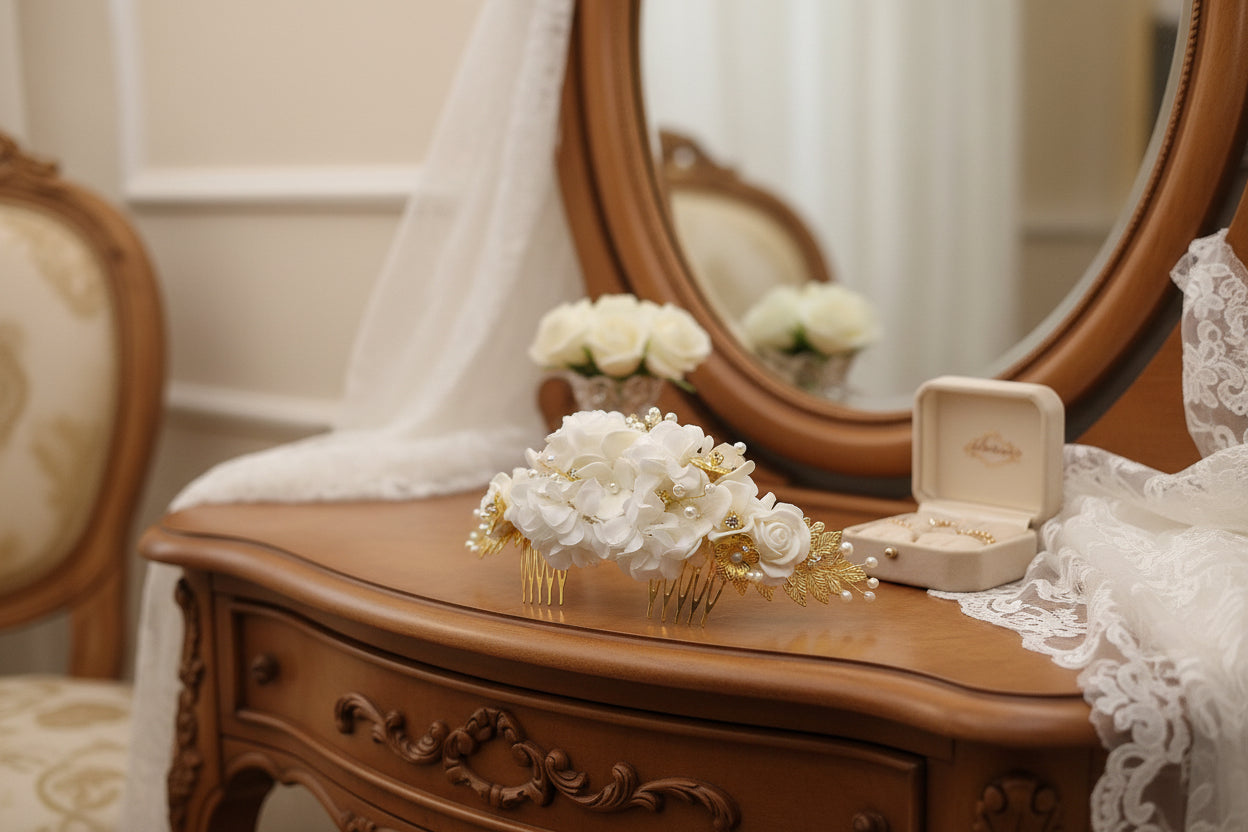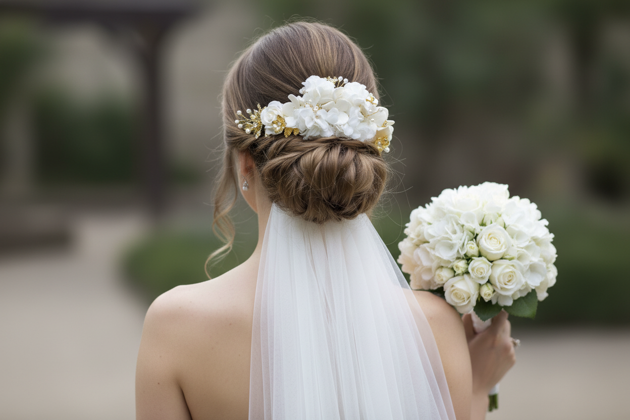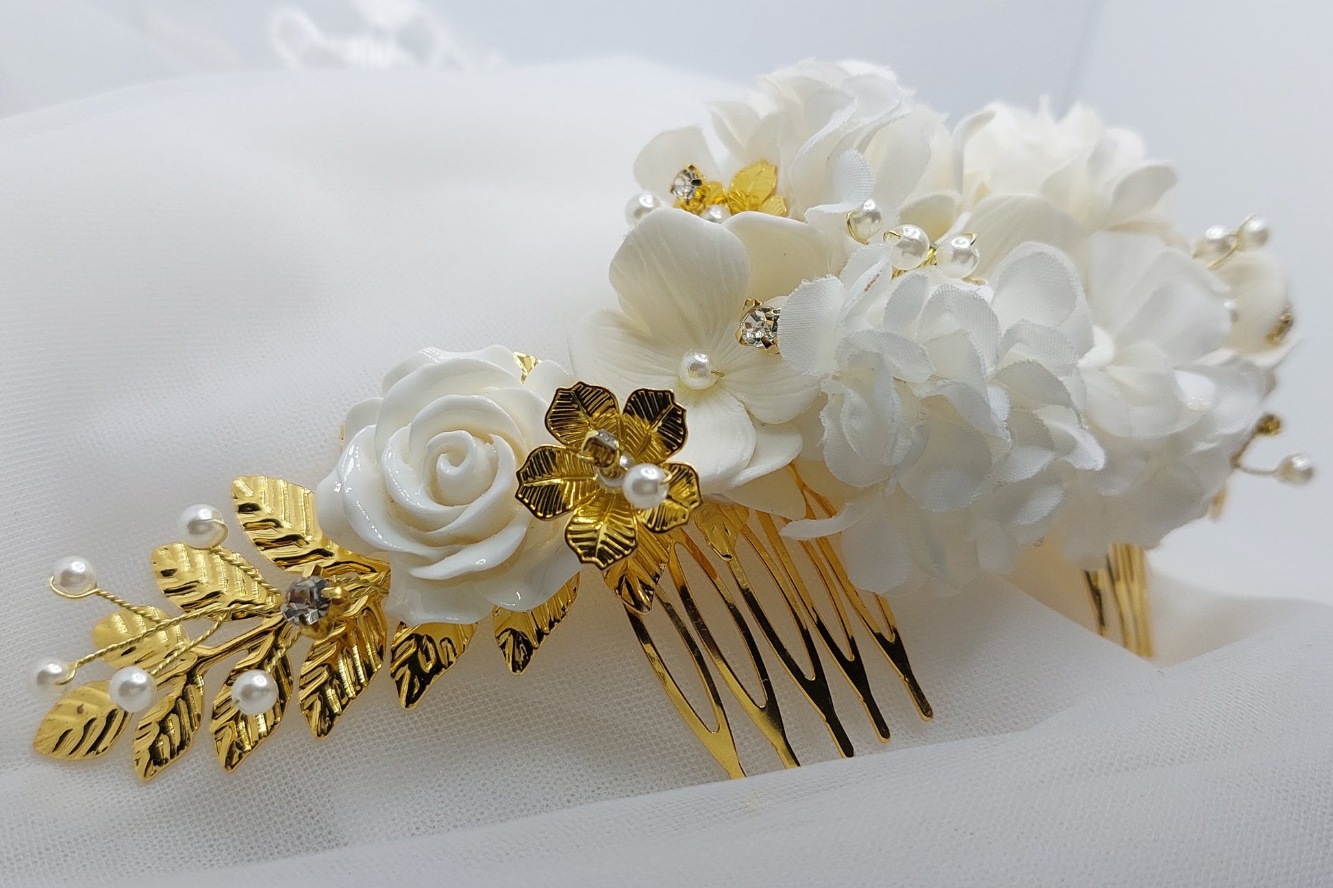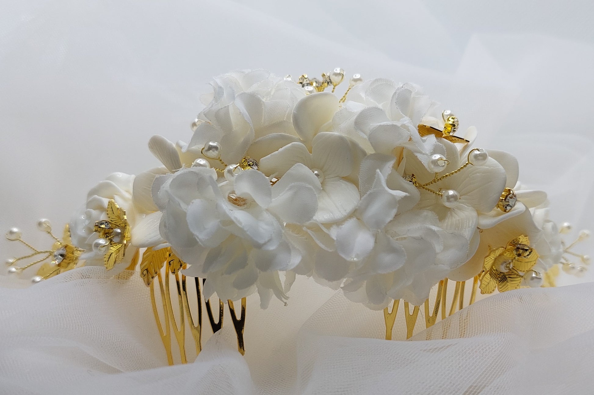 Este toucado com hortênsias é uma verdadeira joia de delicadeza e sofisticação. As flores brancas, entrelaçadas com pérolas e detalhes dourados, evocam uma aura romântica e atemporal. Cada elemento parece ter sido colocado com intenção poética, como se narrasse uma história de elegância discreta e encanto natural.